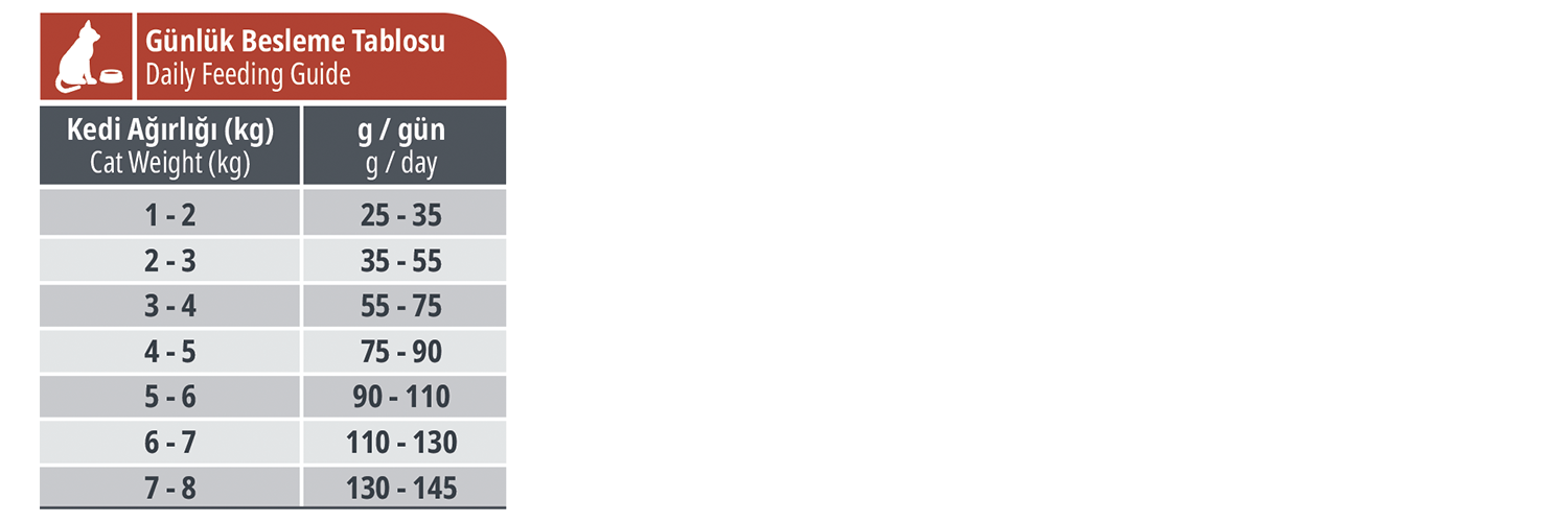 Nutritive Additions(/kg): Vitamin A (3A672A): 18000 IU, Vitamin D3 (3A671): 1500 IU, Vitamin E (3A700): 200 mg, Vitamin C (3A300): 400 mg, Vitamin B1 (3A821) - B2 - B3 (Niacin-3A315) - B6 (3A831) - B12 - B7 (Biotin-3A880) - B9 (Folic Acid-3A316), Vitamin K3 (3A710): 0,2 mg, Taurine (3A370): 1500 mg, Iron (3B103): 200 mg, Iodine (3B202): 1,5 mg, Copper (3B405): 13 mg, Manganese (3B502): 50 mg, Zinc (3B603): 140 mg, Selenium (3B802): 0,3 mg, Choline (3A890): 2500 mg, Calcium Pantothenate (3A841).