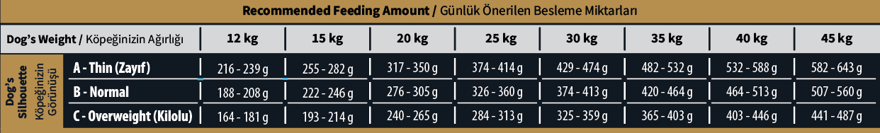 • Köpeğinizin ağırlığına (kg) ve siluetine (A- Zayıf, B- Normal, C- Kilolu) göre önerilen günlük beslenme miktarları (gram/gün) için tabloya bakınız.
