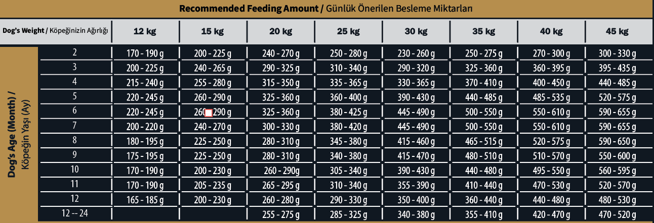 - Yavru köpeğinizin tahmini yetişkin ağırlığına (kg) ve ayına göre önerilen günlük beslenme miktarları (gram/gün) için tabloya bakınız.
