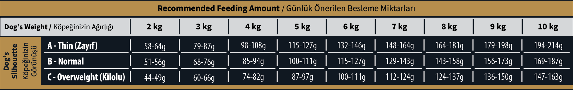 • Köpeğinizin ağırlığına (kg) ve siluetine (A- Zayıf, B- Normal, C- Kilolu) göre önerilen günlük beslenme miktarları (gram/gün) için tabloya bakınız.