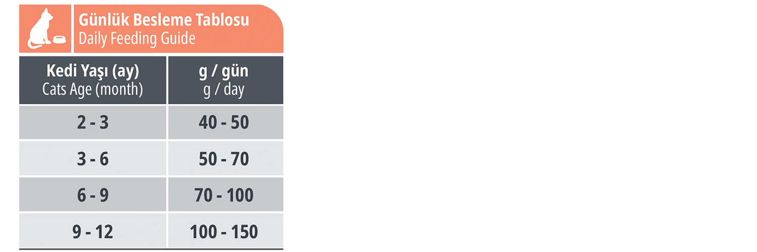 Besleyici İlaveler (/kg): Vitamin A (3A672A): 18000 IU, Vitamin D3 (3A671): 1500 IU, Vitamin E (3A700): 200 mg, Vitamin C (3A300): 400 mg, Vitamin B1 (3A821) - B2 - B3 (Niasin-3A315) - B6 (3A831) - B12 - B7 (Biotin-3A880) - B9 (Folik Asit-3A316), Vitamin K3 (3A710): 0,2 mg, Taurin (3A370): 1500 mg, Demir (3B103): 200 mg, İyot (3B202): 1,5 mg, Bakır (3B405): 13 mg, Manganez (3B502): 50 mg, Çinko (3B603): 140 mg, Selenyum (3B802): 0,3 mg, Kolin (3A890): 2500 mg, Kalsiyum Pantotenat (3A841).