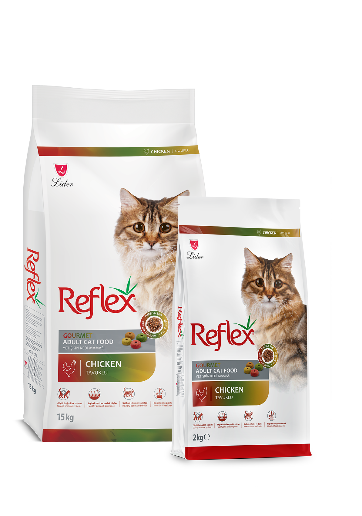 Kedi ve köpeklerin hayatının her evresinde tam ve dengeli beslenmenin çok önemli olduğunu iyi biliyoruz. Reflex Plus kuru mama çeşitleri, kedi ve köpeklerin değişen yaş ve fizyolojik dönemlerine göre özel hazırlanan zengin ve fonksiyonel içerikleriyle can dostlarımızın tüm beslenme gereksinimlerini karşılar.